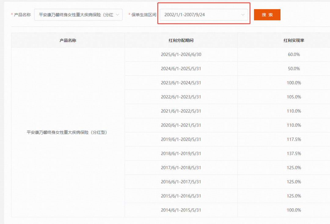 比如平安人寿的康乃馨终身女性重疾险(分红型),现在还能在官网查到红利实现率。
