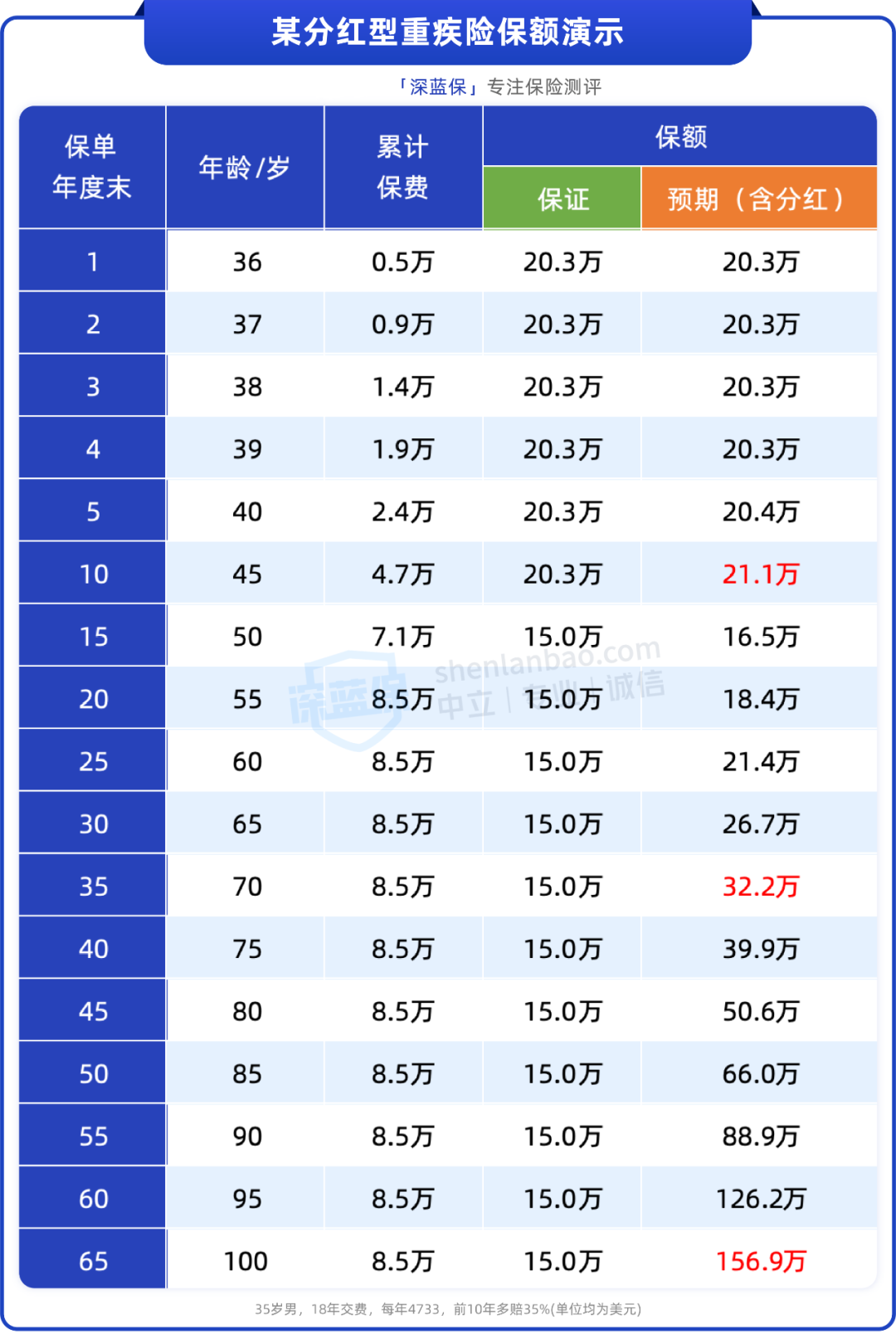 以35岁男,每年交4733美元,交18年为例,保证保额为15万美元,前10年多赔5.25万美元,具体的「保证保额」和「含分红的预期保额」如下表: