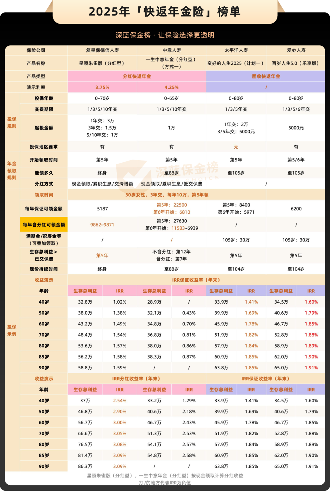 年金险榜单:分为养老年金榜单和快返年金榜单,快返年金增加爱心人寿『百岁人生5.0(乐享版)』,固定领取比较高。