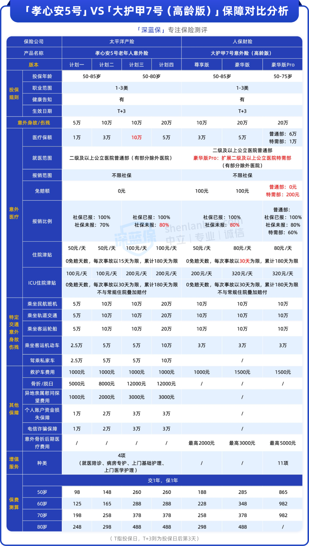在众多产品中,孝心安5号老年人意外险和大护甲7号意外险(高龄版)备受关注,专为50至85岁人群设计。那么,这两款产品究竟哪款更适合咱爸妈?今天我们就来详细对比一下。