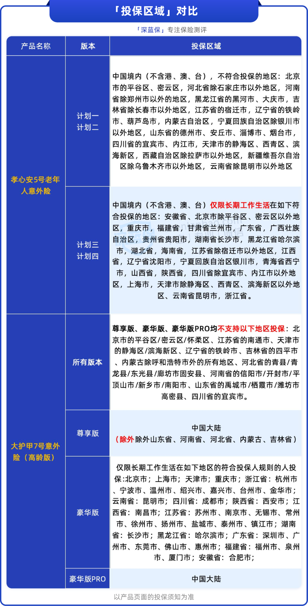 这两款产品的投保区域限制都比较严格,大家投保时一定要核实好爸妈的常住地是否在投保区域内。