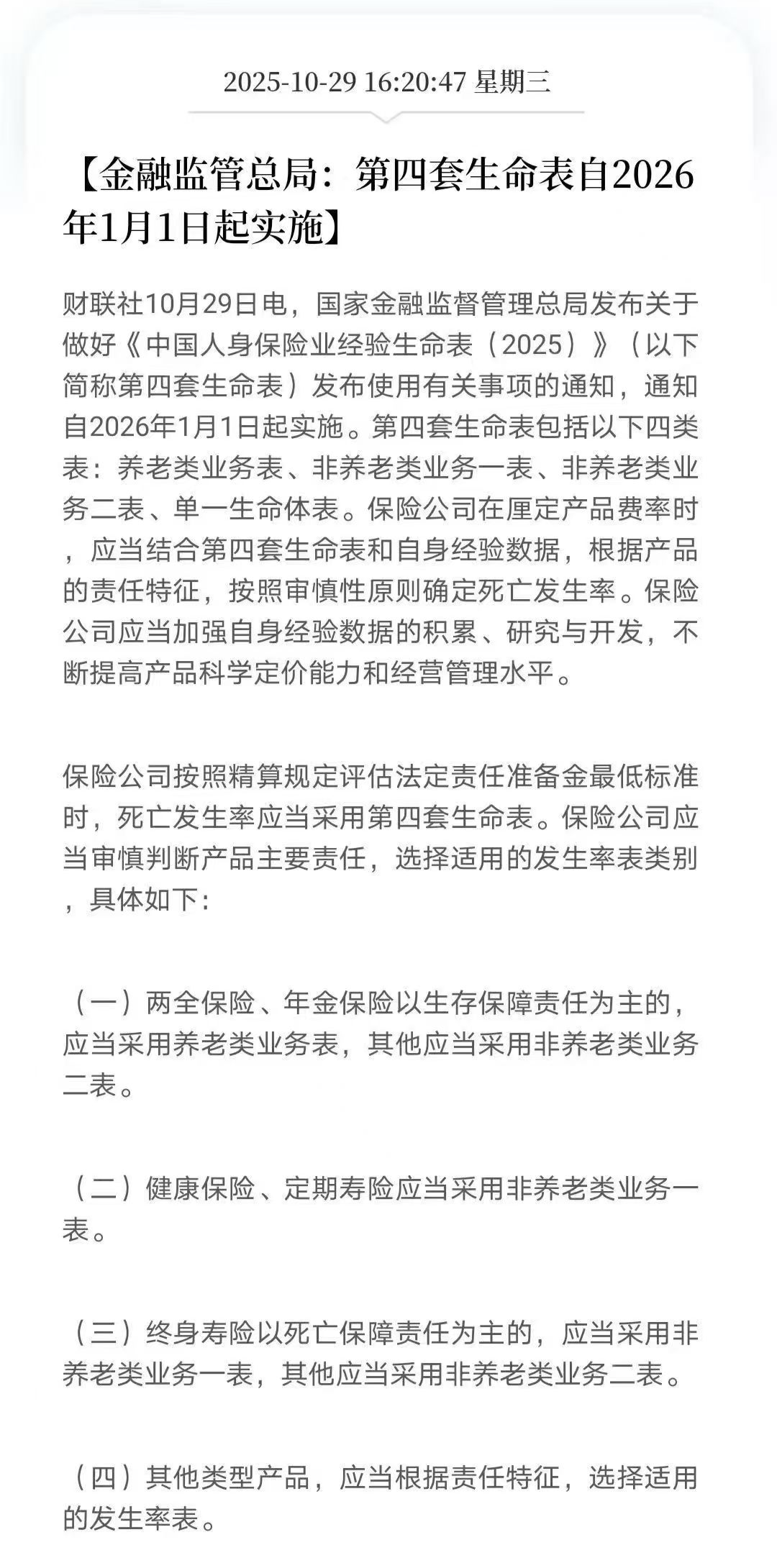 不过,在这里我也要给大家同步一个不太好的消息,2026年1月起,第四套生命表要开始实施了。