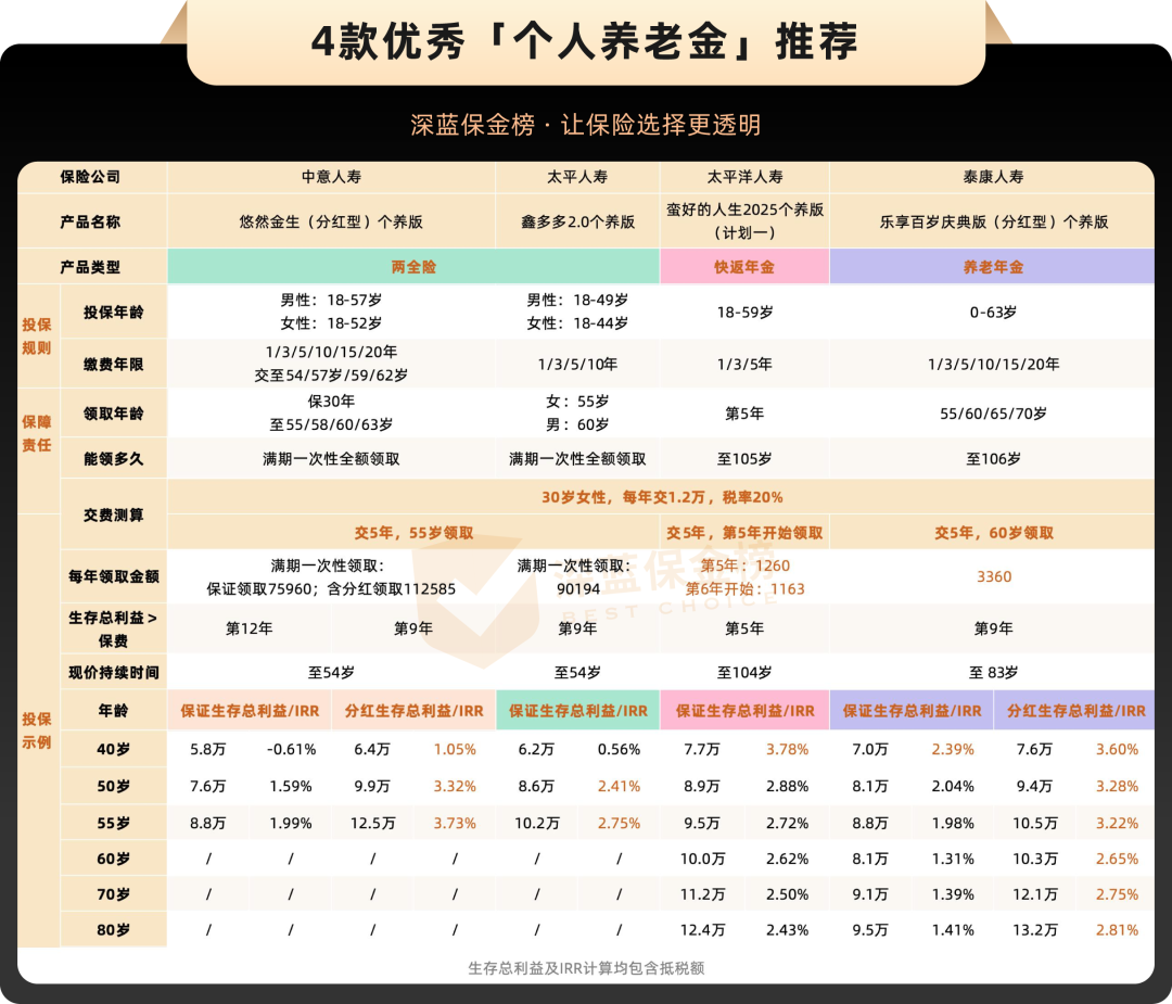 我们也帮大家挑了4款个人养老金保险,包含两款两全险、1款快返年金,1款养老年金:
