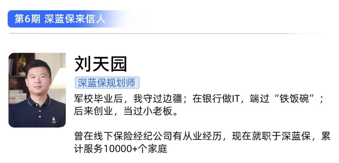 大家好,我是深蓝保来信第6期的来信人——刘天园,有些朋友也会亲切地称呼我“园哥”。