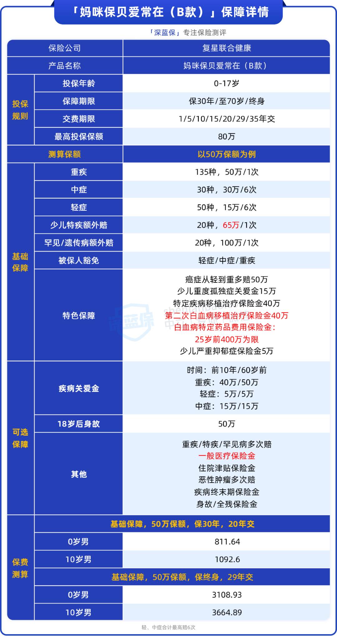 作为老牌少儿重疾险IP的新品,妈咪保贝爱常在B款(下面简称妈咪保贝)一如既往优秀,基础保障齐全,自带一系列的特色保障。