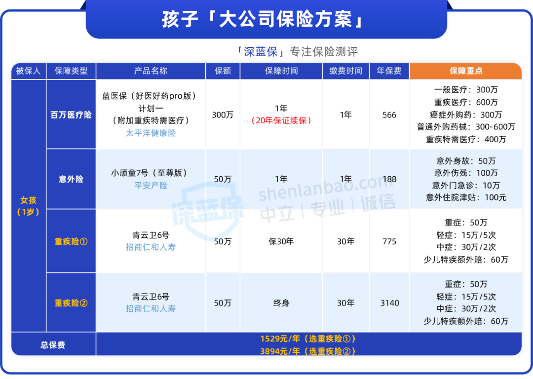 我们筛选了几百款大保司产品,最终设计了以下方案,并配置了2种重疾险买法,最低只花1千多,就能给孩子买到很全面保障: