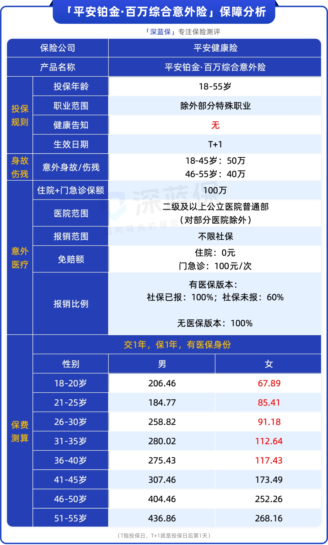 这款费率设置是按年龄段和性别区分的,其中18-30岁的女性投保,一年不到100元的保费,就能获得高达100万的意外医疗保额和50万的身故伤残保障,性价比非常高。
