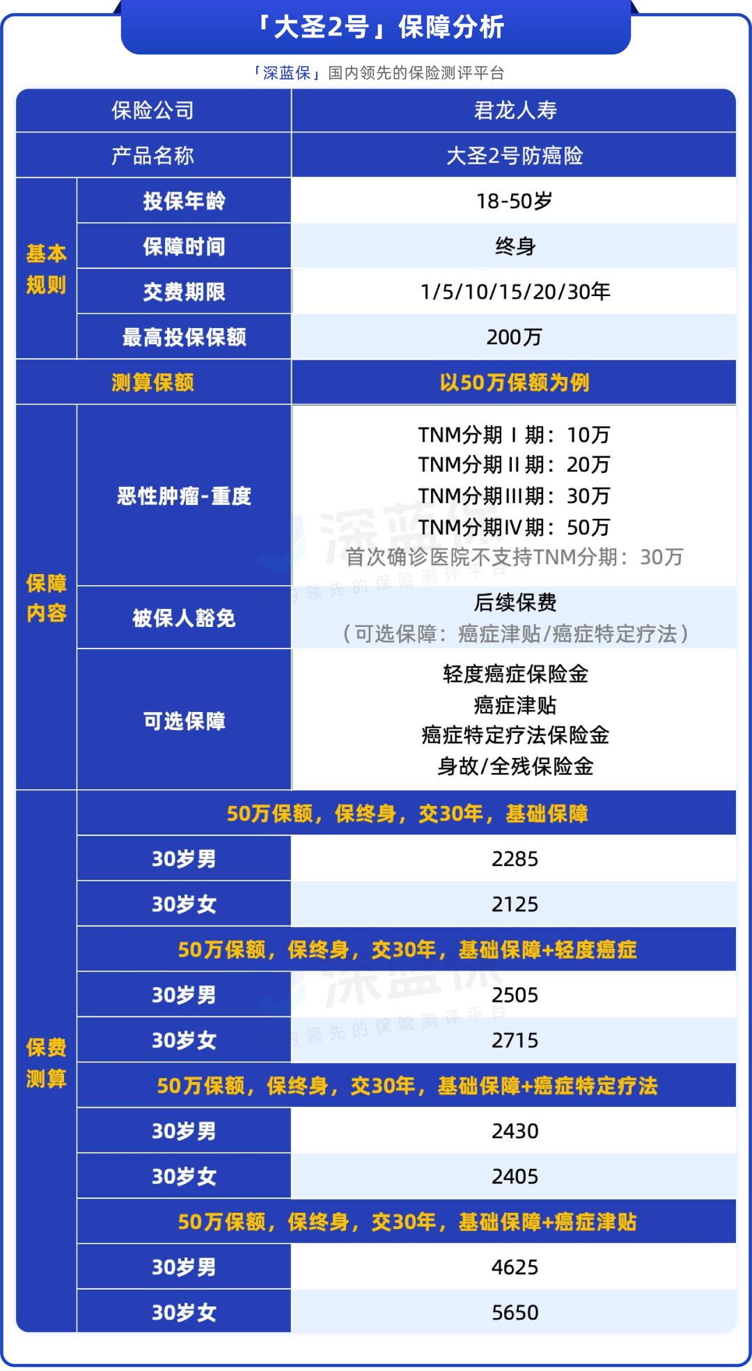 而大圣2号能买到50万保额,且不幸患癌最高能拿到100万。即便不是癌症,也有50万的重疾险保额兜底。