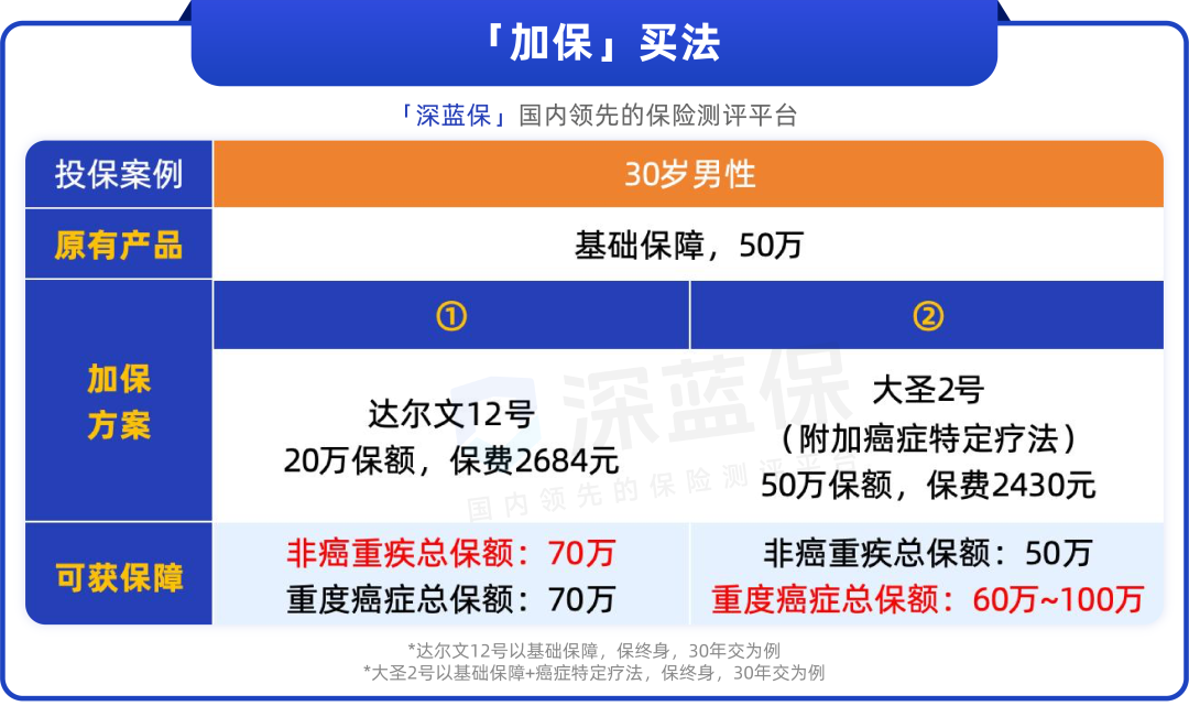 假如30岁男性已经有了50万的重疾险,打算花个两千多块加保终身保障。