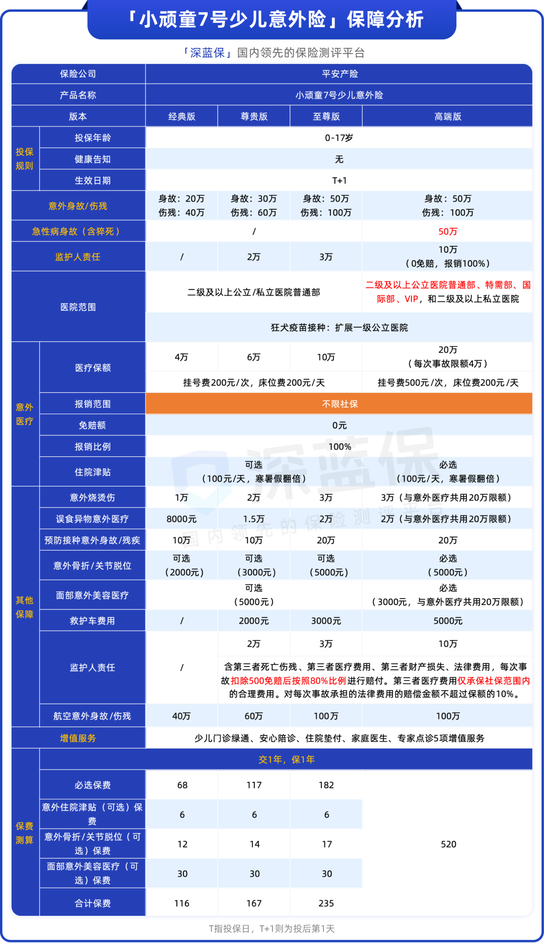 小顽童7号由平安产险承保,一共有四个版本,具体保障如下: