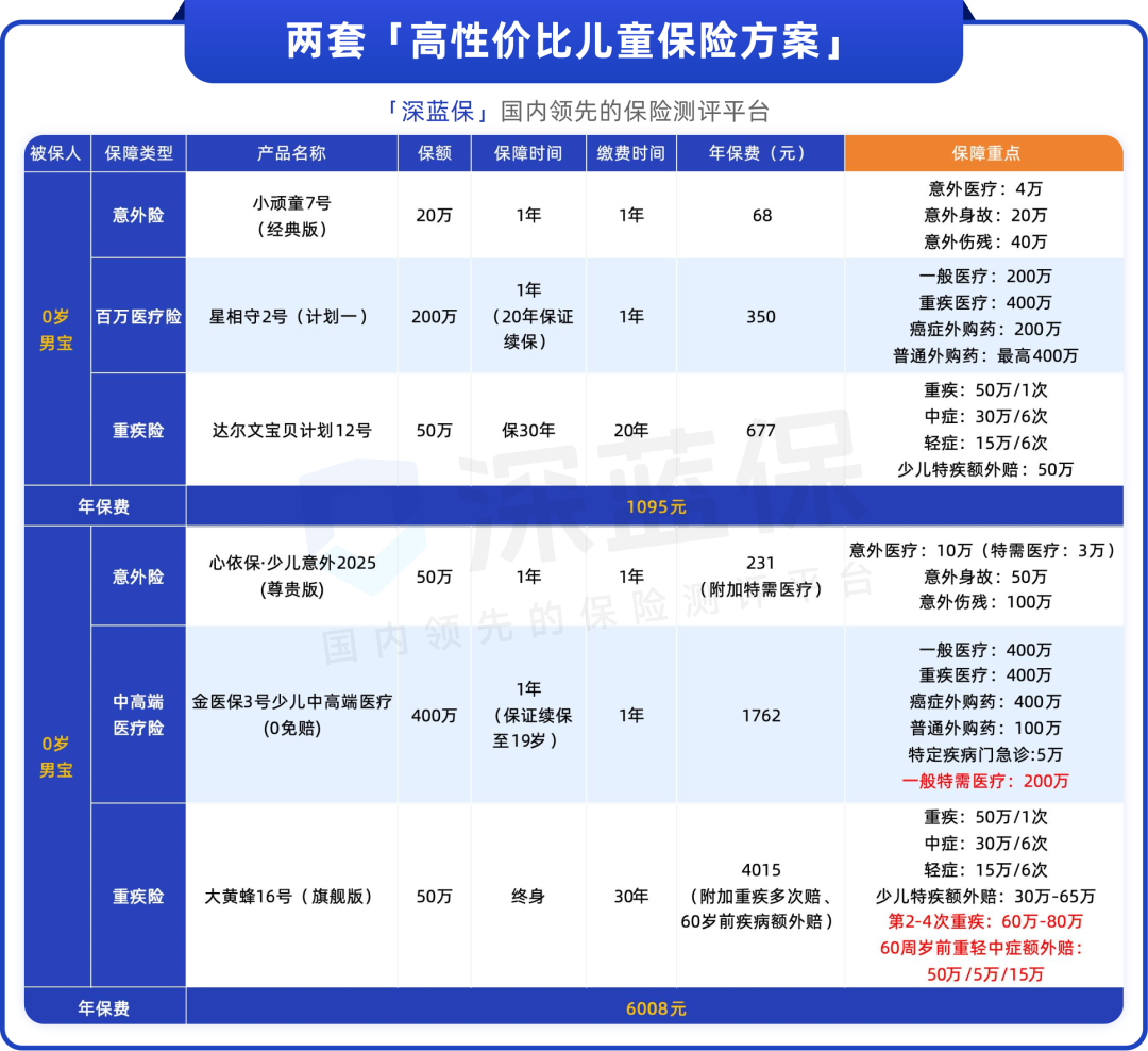 因此,在给孩子配置意外险的基础上,还需要同步规划疾病保障,打造“意外+疾病”的双重保障体系。下面以“0岁男宝”为例,给大家分享两套高性价比保险方案,0-17岁的孩子都可以参考: