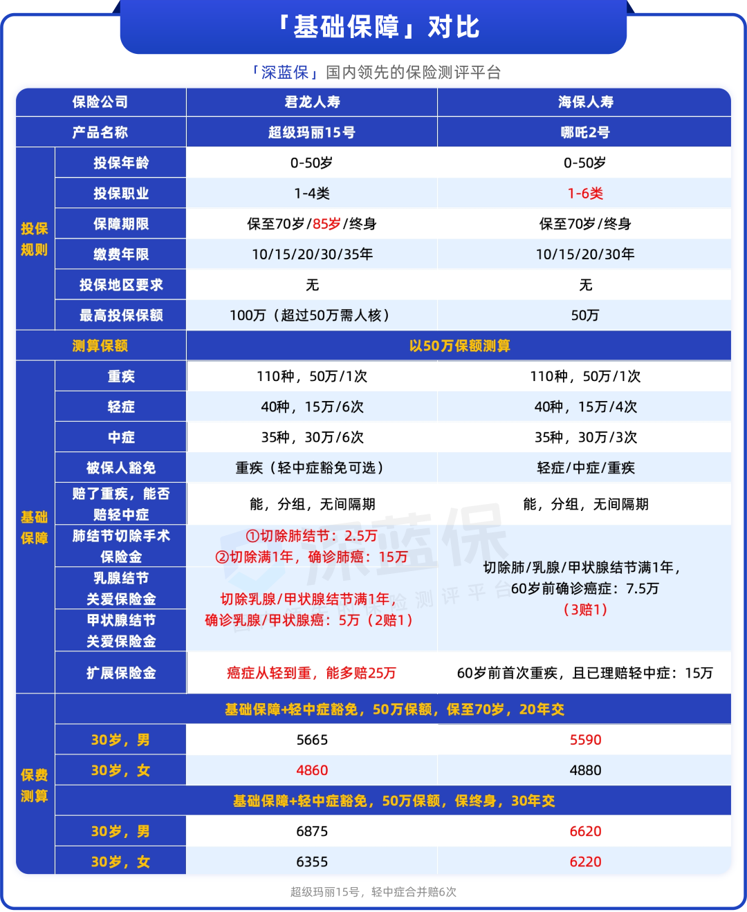 我们先看看投保规则和基础保障的对比,咱们重点看差异点: