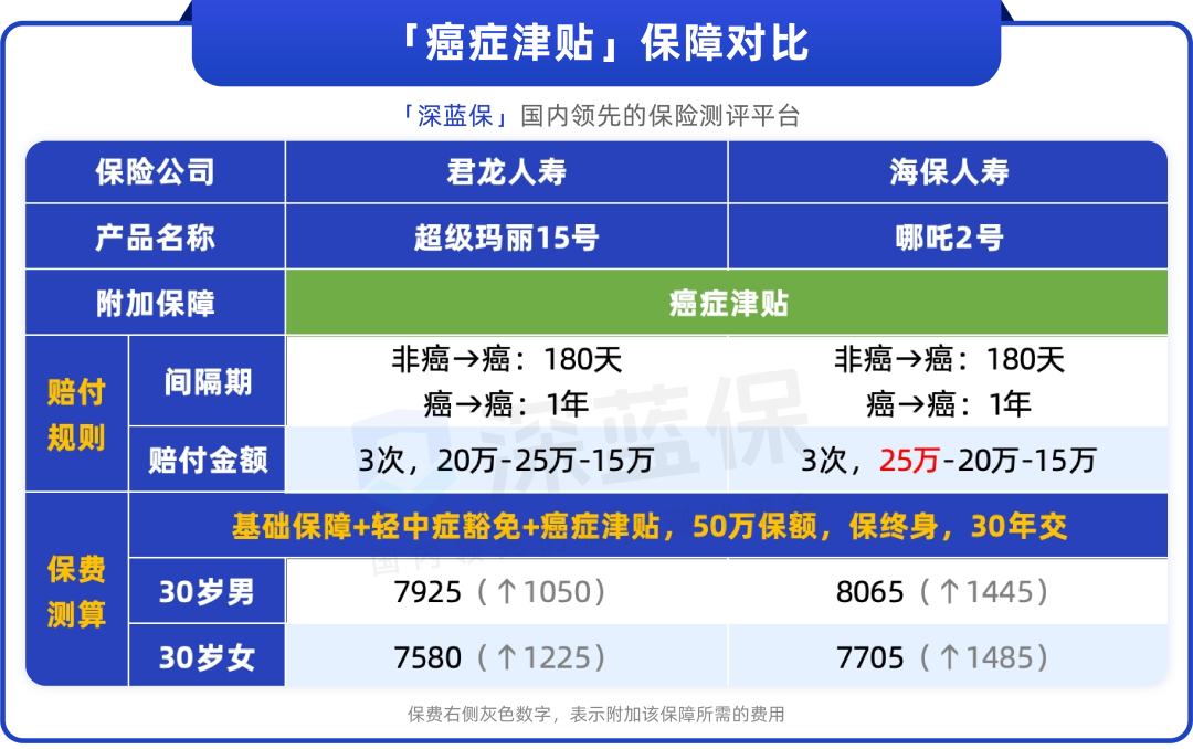 我们一起看看两款产品的癌症津贴理赔规则和附加保费: