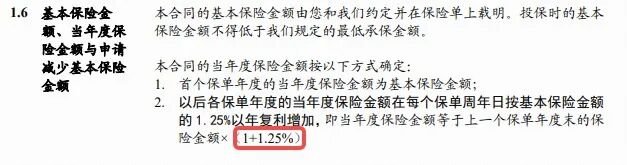 可以看到,条款清楚写着:保额增长比例每年是1.25%,它一般等于预定利率,因为高于会违反监管要求。