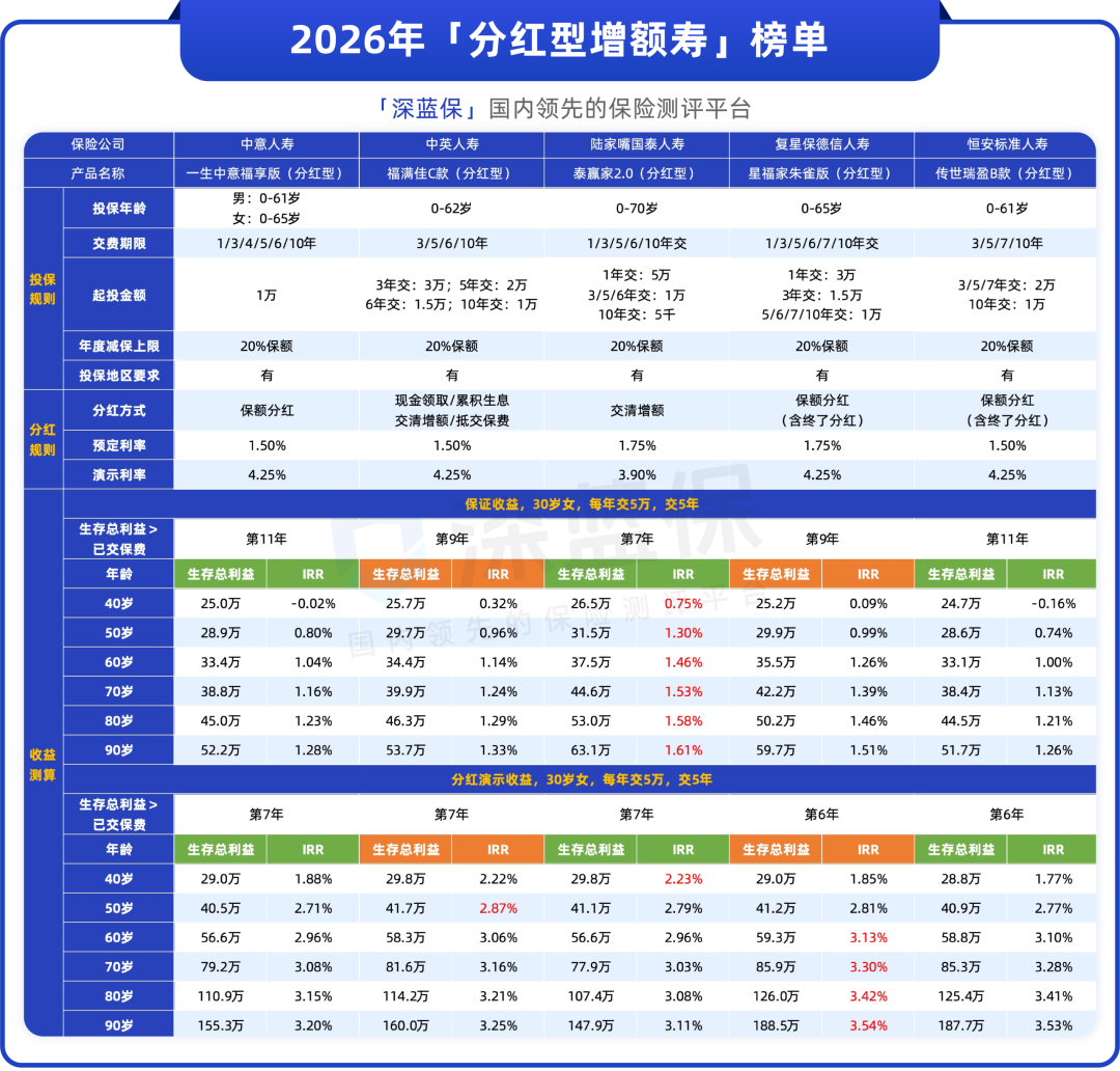 还有一款恒安标准人寿的传世瑞盈B款,也是相同设计,含分红预期收益可达3.53%,公司风险评级AAA更高,但保证收益更低,大家可以按需考虑。