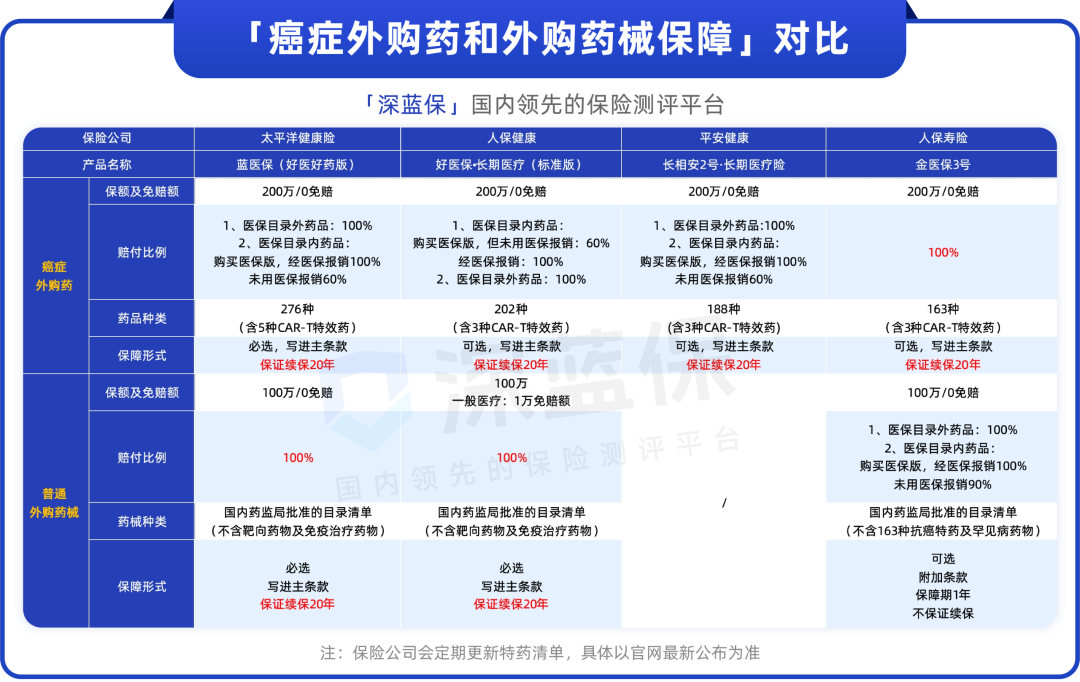 从外购药保障来说,蓝医保(好医好药版)>金医保3号≈好医保(标准版)>长相安2号。