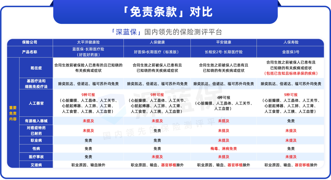 下面我们来看看这四款产品的免责条款主要有以下区别: