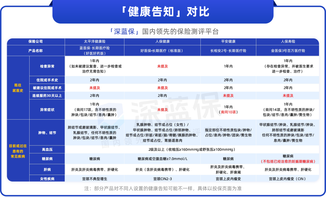 可见好医保(标准版)的健康告知尺度更宽松一些,不问及1年内的检查异常和异常症状。蓝医保(好医好药版)没问到过往是否被建议住院或手术,长相安2号和金医保3号都没有问到连续服药30天以上的情况。