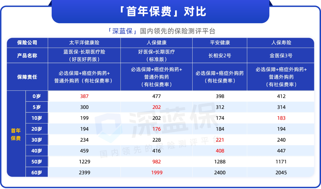 0-4岁买蓝医保(好医好药版)保费低一点,青壮年买长相安2号的费率稍占优势,50-55岁买好医保(标准版)更便宜一些。