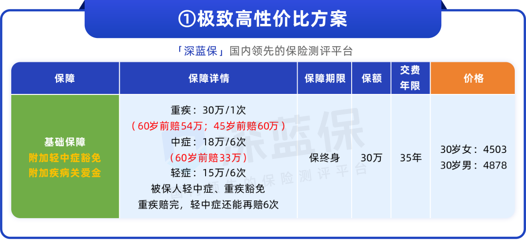 目前经济紧张,想省钱买保险的朋友,可以选30万保额保终身,附加疾病关爱金: