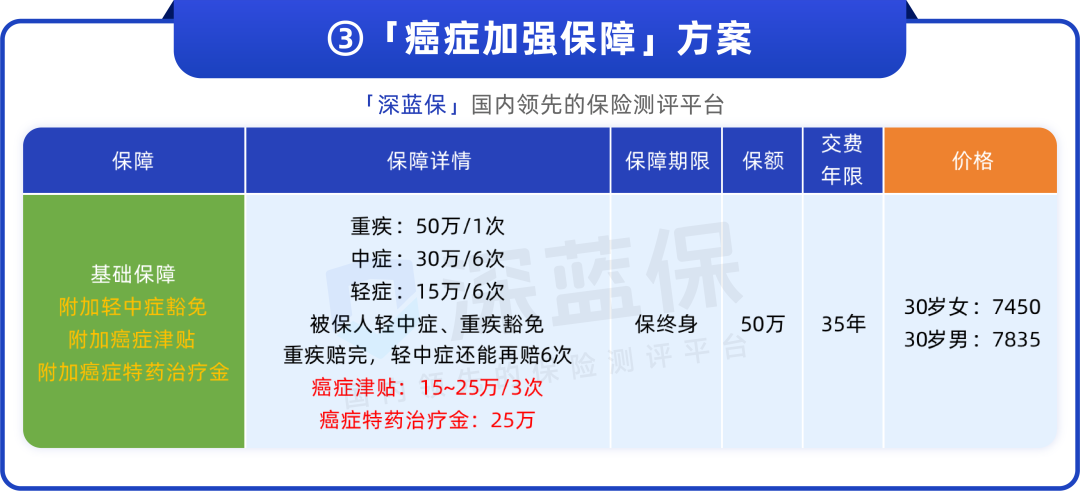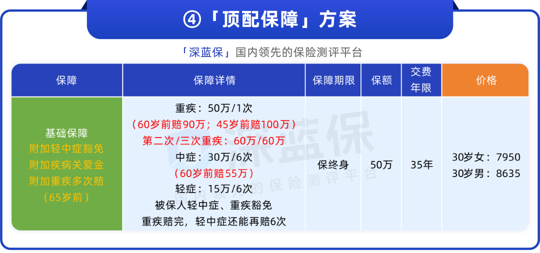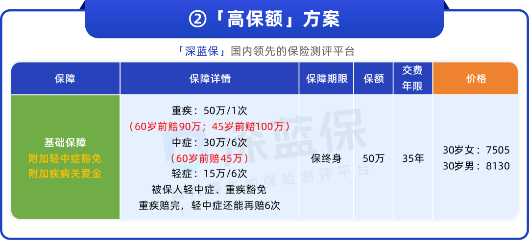 如果预算充足,还可以选以下方案,加重疾多次赔,能一次性买到非常全面的终身保障: